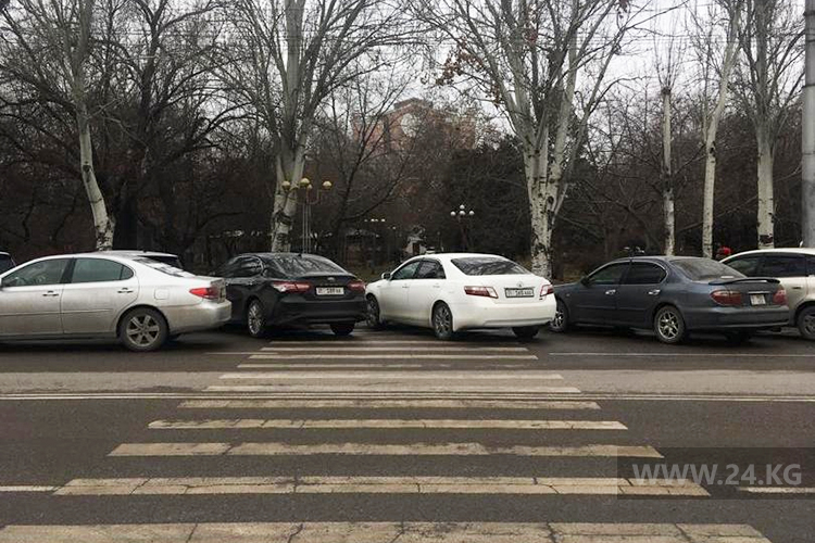 На зебре постоянно ставят автомобили и на улице Тыныстанова.Жительница Бишкека прислала видео с проспекта Жибек Жолу возле мечети, где каждую пятницу такая ситуация. Машины везде. Из-за их большого количества здесь сложно проехать троллейбусам.