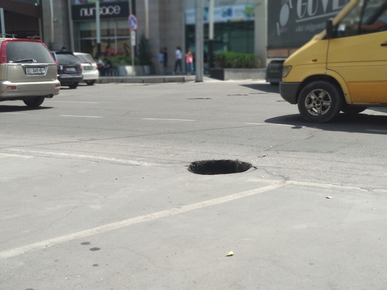 Яма появилась на проезжей части напротив ТРЦ «Бишкек Парк».