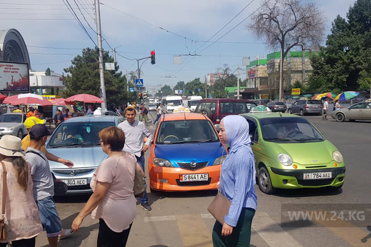 Вновь жалуются на таксистов. На перекрестке проспекта Чуй и улицы Кулиева такси стоят на проезжей части, закрывая пешеходный переход.