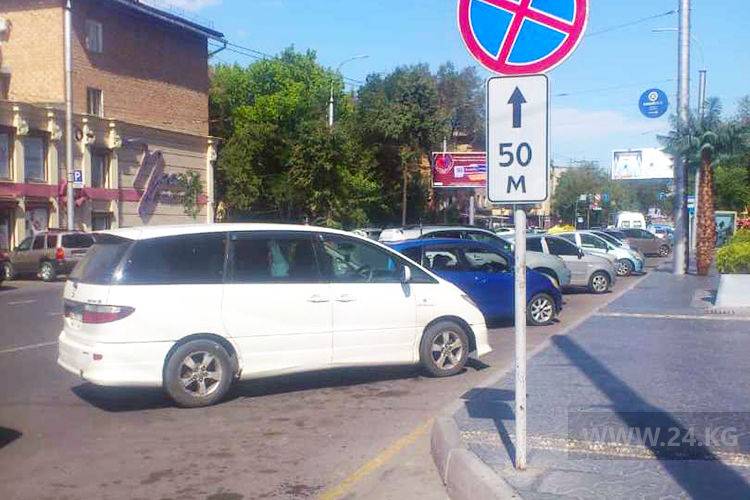 Водители не боятся оставлять машины под запрещающими знаками. Вот обычная картина на перекрестке проспекта Чуй и улицы Исанова.