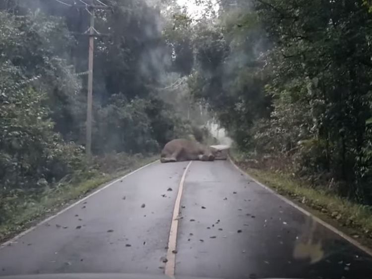 Слона по имени Нга-Тонг заметили на одной из дорог, проходящих через заповедную зону в Таиланде. 57-летний водитель Наттават Пацунгсинг снял могучего зверя, мирно спавшего на трассе, пишет издание Daily Mail.