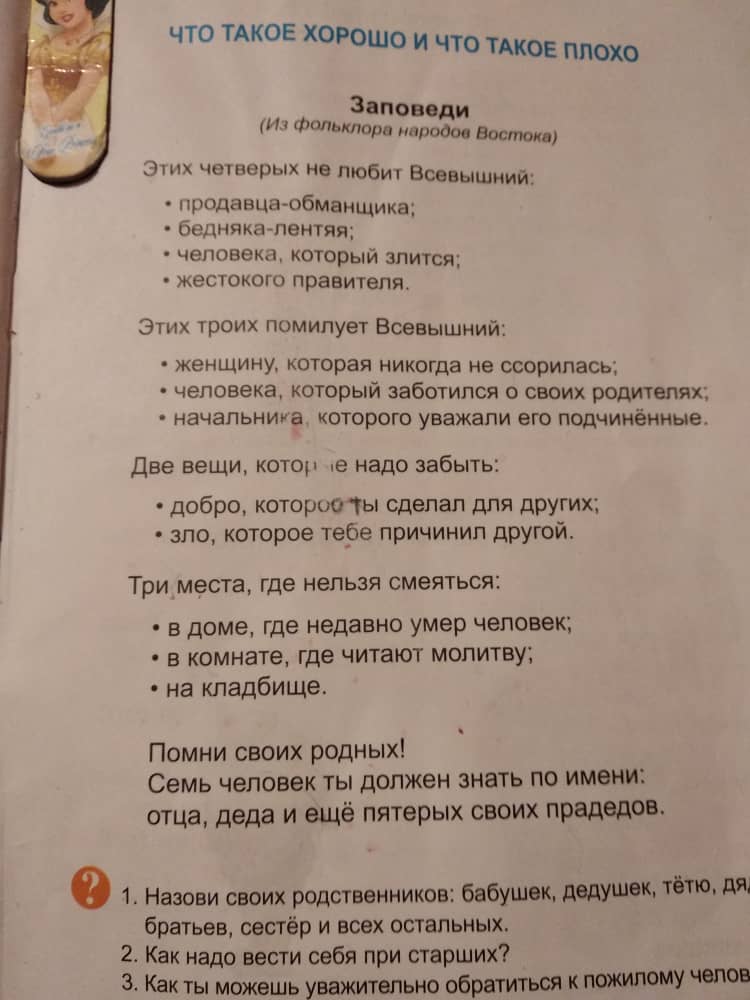 «Одна из тем учебника по чтению гласит: «Что такое хорошо и что такое плохо». Удивилась, когда ребенок начал читать про Всевышнего и кого он помилует. Оказывается, авторы включили в учебник заповеди из фольклора народов Востока. Но в нем много интересных, поучительных произведений, которые достойны изучения, зачем в учебник включать подобные заповеди?» — написала она.