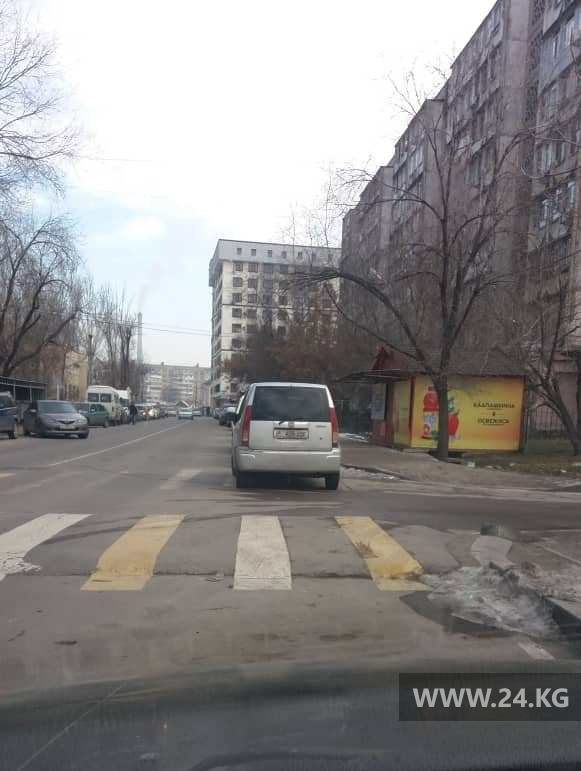 Закрыв проход для горожан, на зебре встал и водитель «Ниссана» на перекрестке Токтогула/Калыка Акиева.«Машина припаркована на проезжей части на проспекте Шабдана Баатыра, 71. Видимо, хозяин после Нового года забыл, где оставил машину», — написал автор фото.