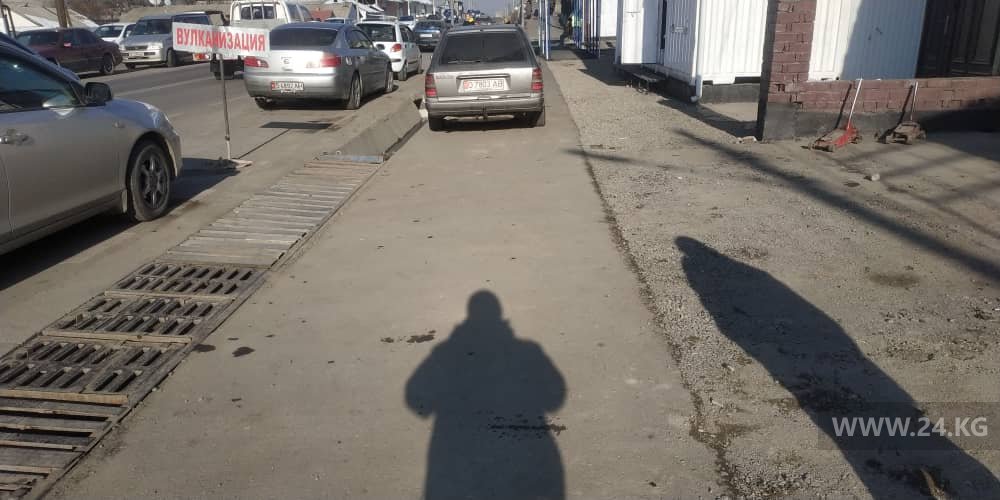 В Оше на улице Шакирова по тротуару невозможно пройти. По словам автора снимков, людям, чтобы обойти в некоторых местах машины, приходится выходить на проезжую часть.