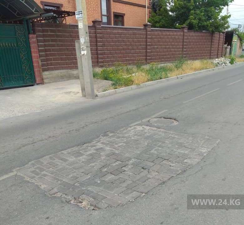 Яму в районе пересечения улиц Кайназаровой и Джамгерчинова отремонтировали тротуарной брусчаткой. Об этом 24-kg.com сообщил читатель.