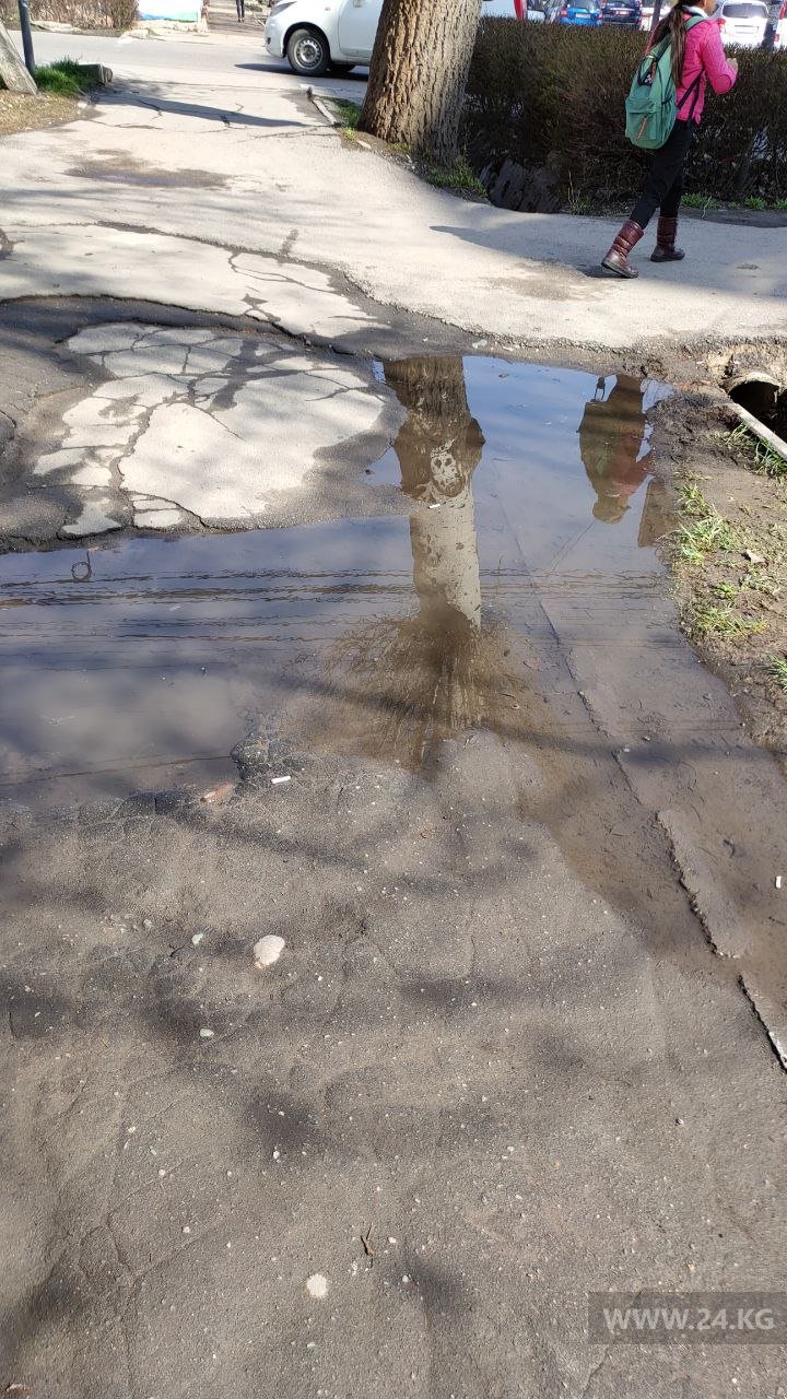 «Я поражаюсь тому, как следят за состоянием тротуаров практически в центре Бишкека. Сколько помню, здесь всегда была ужасная пешеходная дорожка, кругом ямы. Когда идет дождь, постоянно лужи и пройти невозможно», — написала читательница.