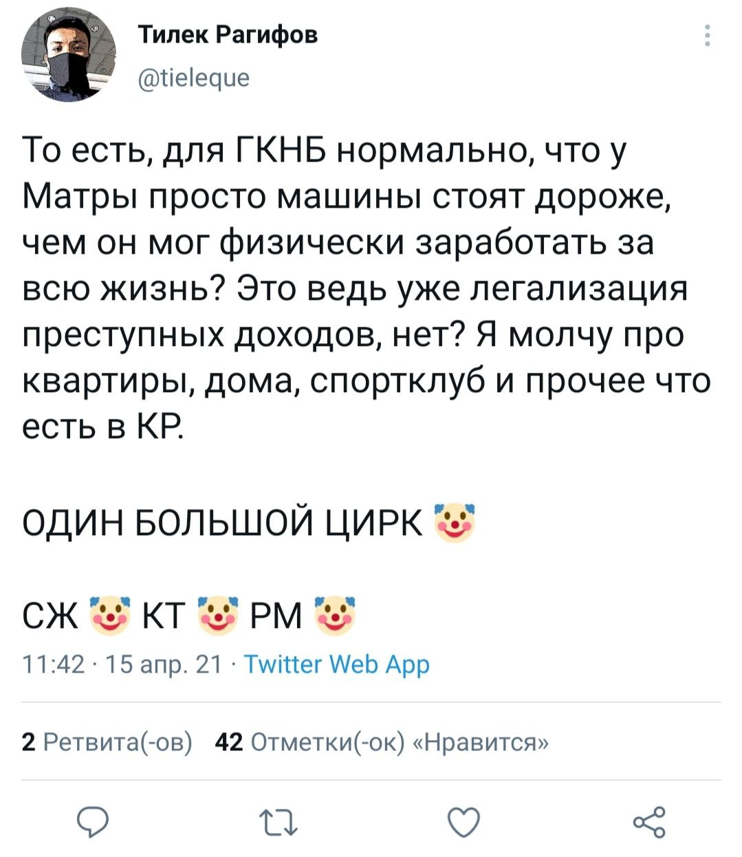 «Это ведь уже легализация преступных доходов, нет? Я молчу про квартиры, дома, спортклуб и прочее», — высказал свое мнение Тилек Рагифов в Twitter.