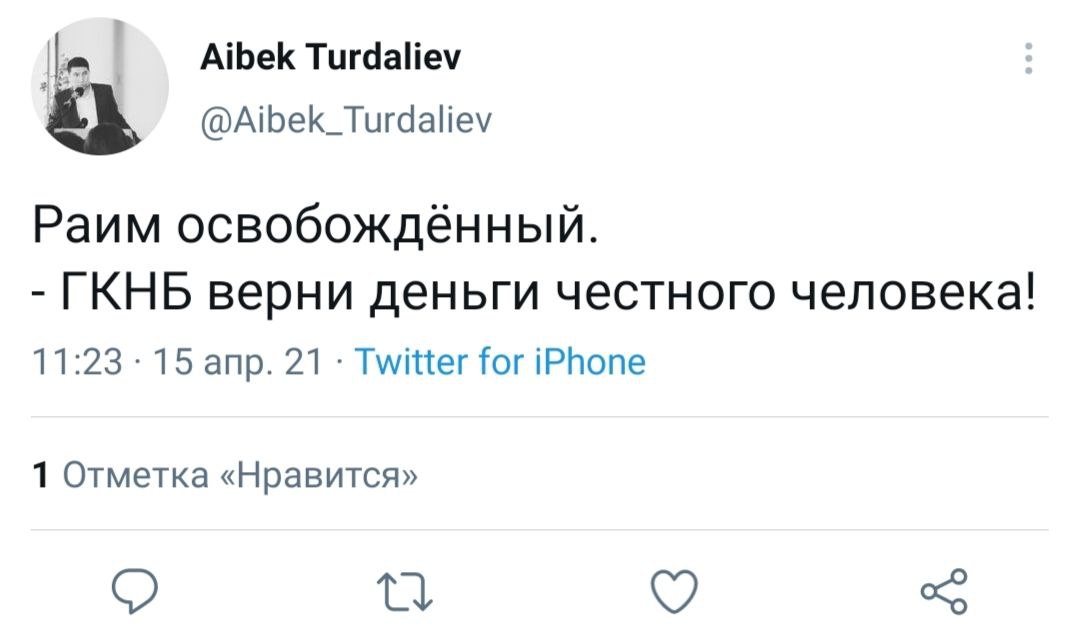 «Надо вернуть человеку 2 миллиарда сомов. Рафик ни в чем не виноват», — комментирует новость дня пользователь Азамат Акенеев, напомнив всем, что ранее Матраимов перевел в доход государства имущество и деньги.«Матраимова отпустили, на митинге по случаю убийства Бурулай и Айзады на глазах милиции провокаторы угрожают митингующим (говорят, что это люди Райымбека Матраимова). Садыр Жапаров наступает на те же грабли, ломая все надежды октябрьских событий и все больше напрягая ситуацию своими дискредитирующими шагами и бездействием. Народ не глуп, как они считают, и все видит», — делится своим мнением в Facebook активист Эрик Абдыкалыков.
