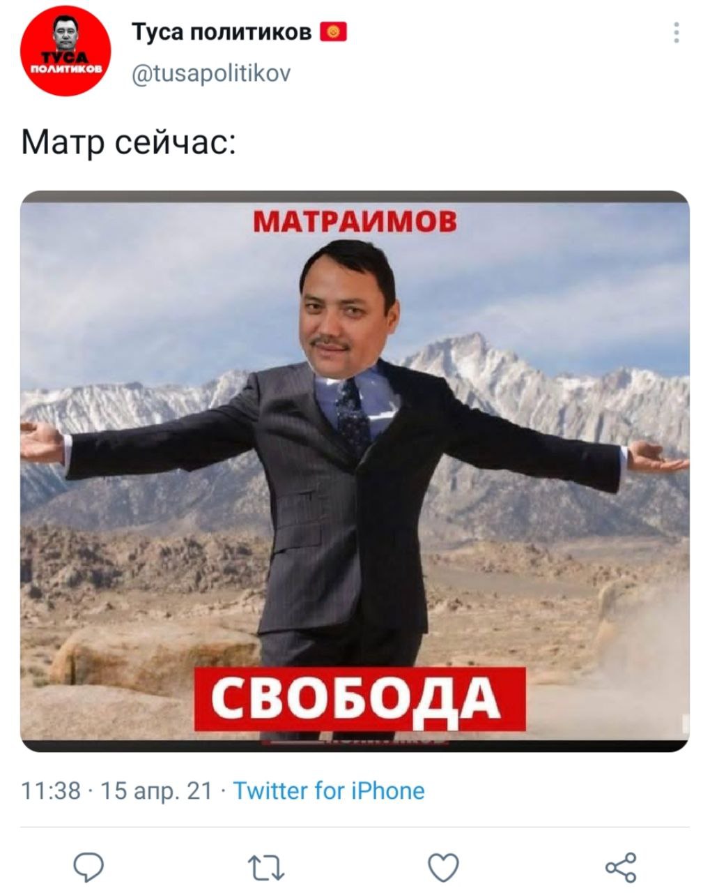 В социальных сетях Facebook и Twitter публикуют мемы и картинки. Подшучивают над тем, как воспринял свое освобождение сам Матраимов.