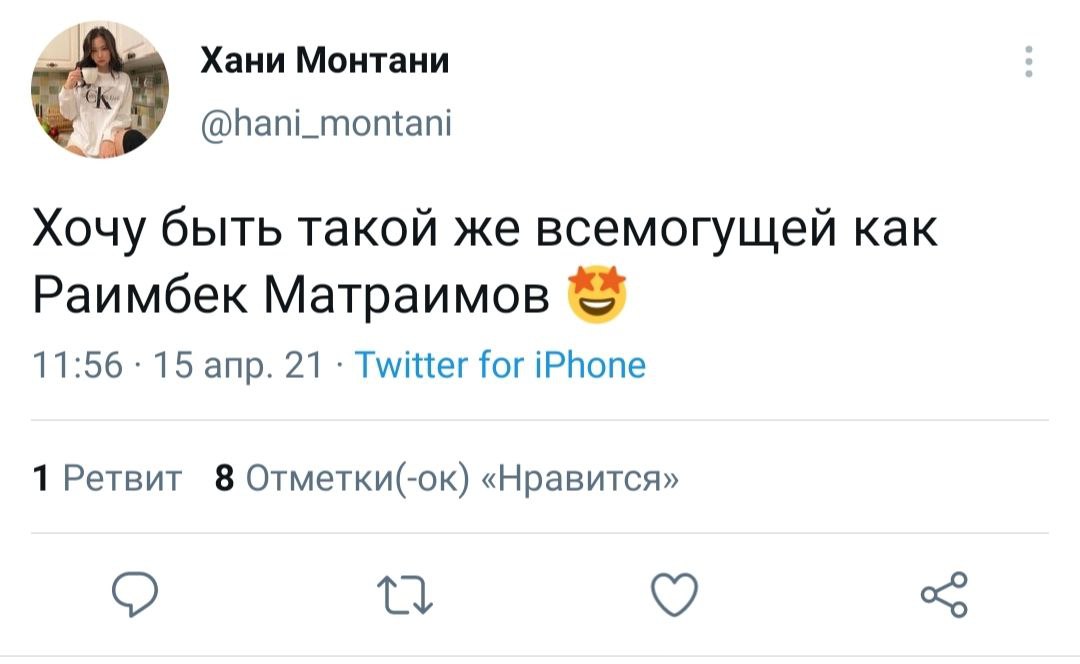 «Матр сделал свое дело, Матр может уходить. Автор: ГКНБ»; «Хочу быть такой же всемогущей, как Райымбек Матраимов» и еще много аналогичных публикаций можно встретить на просторах кырнета.