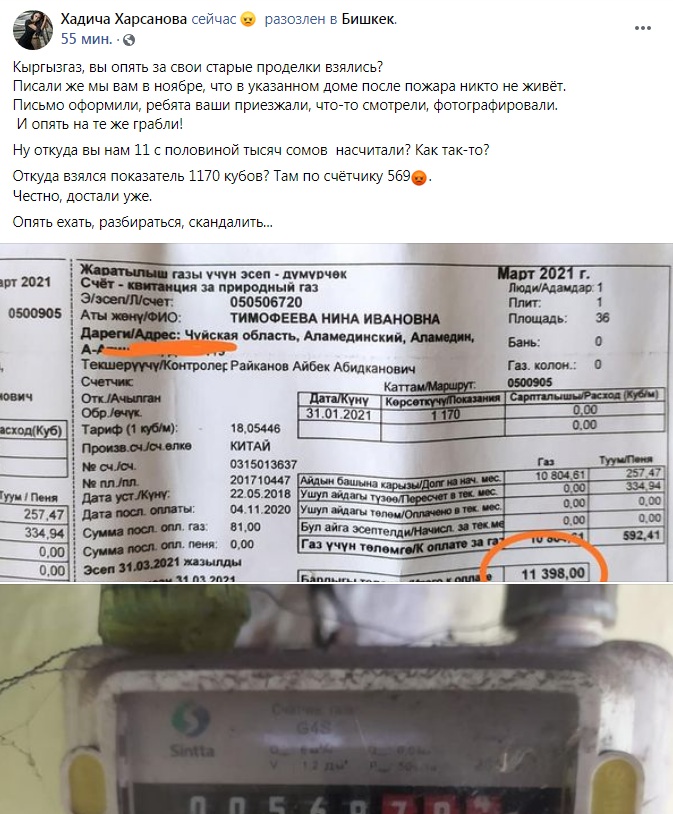 По ее словам, дом в Аламединском районе, куда приходят квитанции, пустует после пожара. Однако на днях принесли квитанцию на оплату газа на 11 тысяч 398 сомов.«За ноябрь — декабрь 2020-го насчитали тоже немалые деньги, почти 12 тысяч сомов. Хотя в октябре платили 135 сомов. Не знаю, что за волшебный пересчет у них. Пришлось разбираться, приезжали сотрудники «Кыргызгаза», зафиксировали все. Но вот опять происходит то же самое. Самое интересное, что после пожара там никто не живет, такие счета просто нереальны. Откуда взялся показатель 1 тысяча 170 кубов? Там по счетчику 569», — рассказала она.