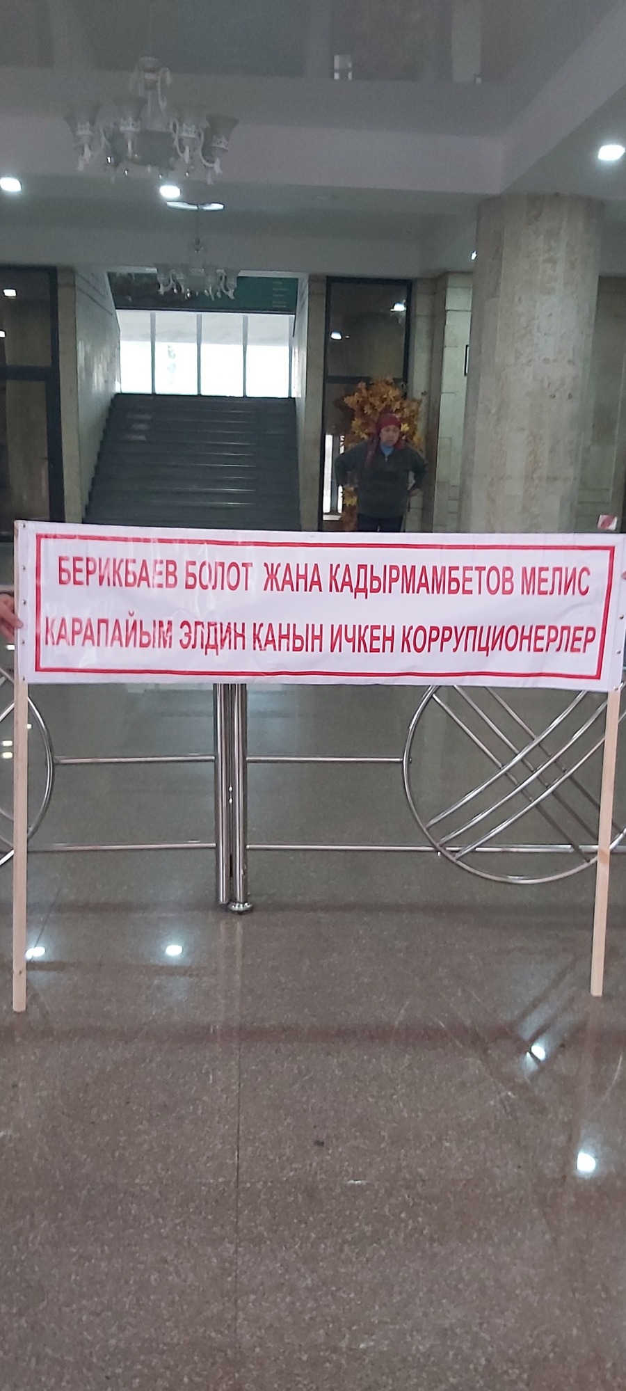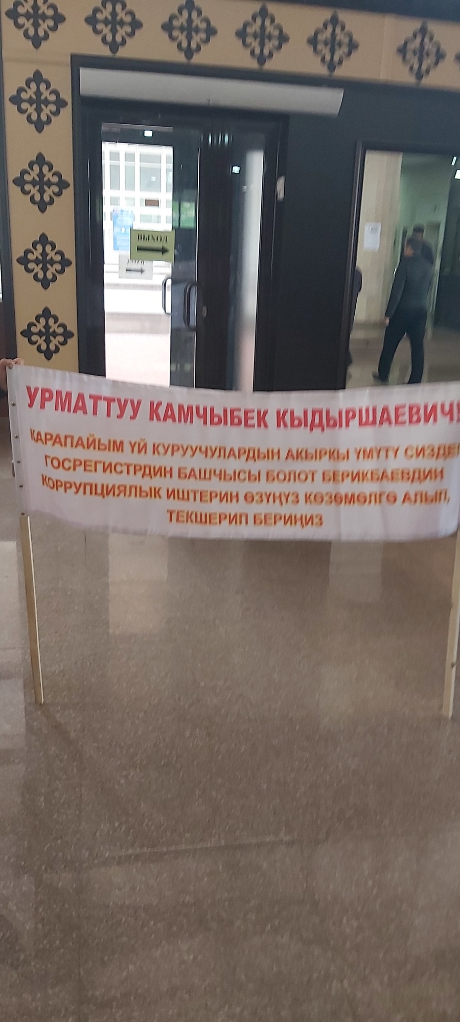 «19 марта я и группа застройщиков встретились с премьер-министром Улукбеком Мариповым и рассказали о действиях сотрудников ГУ, в результате которых мы пострадали. Там творится беспредел. Кто-то не может получить красные книги, у кого-то на одном участке по два хозяина. Люди требуют, чтобы главных в бишкекском «Кадастре» уволили. Министр сельского хозяйства пообещал снять с должности Болотбека Берикбаева (директора ГУ). Митингующие ждут приказа в актовом зале ведомства», — рассказал он.