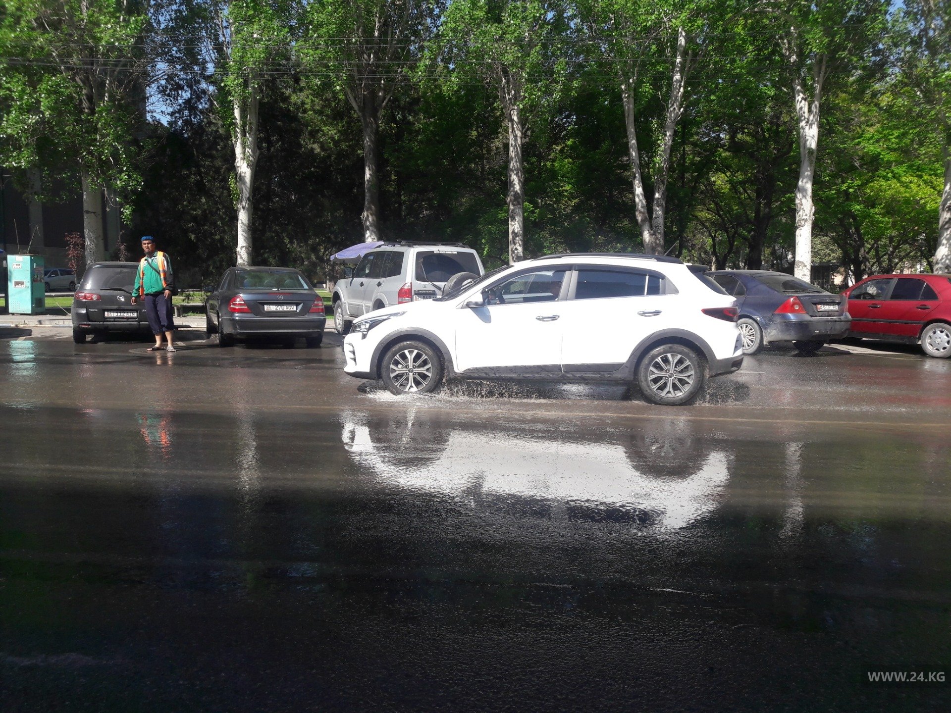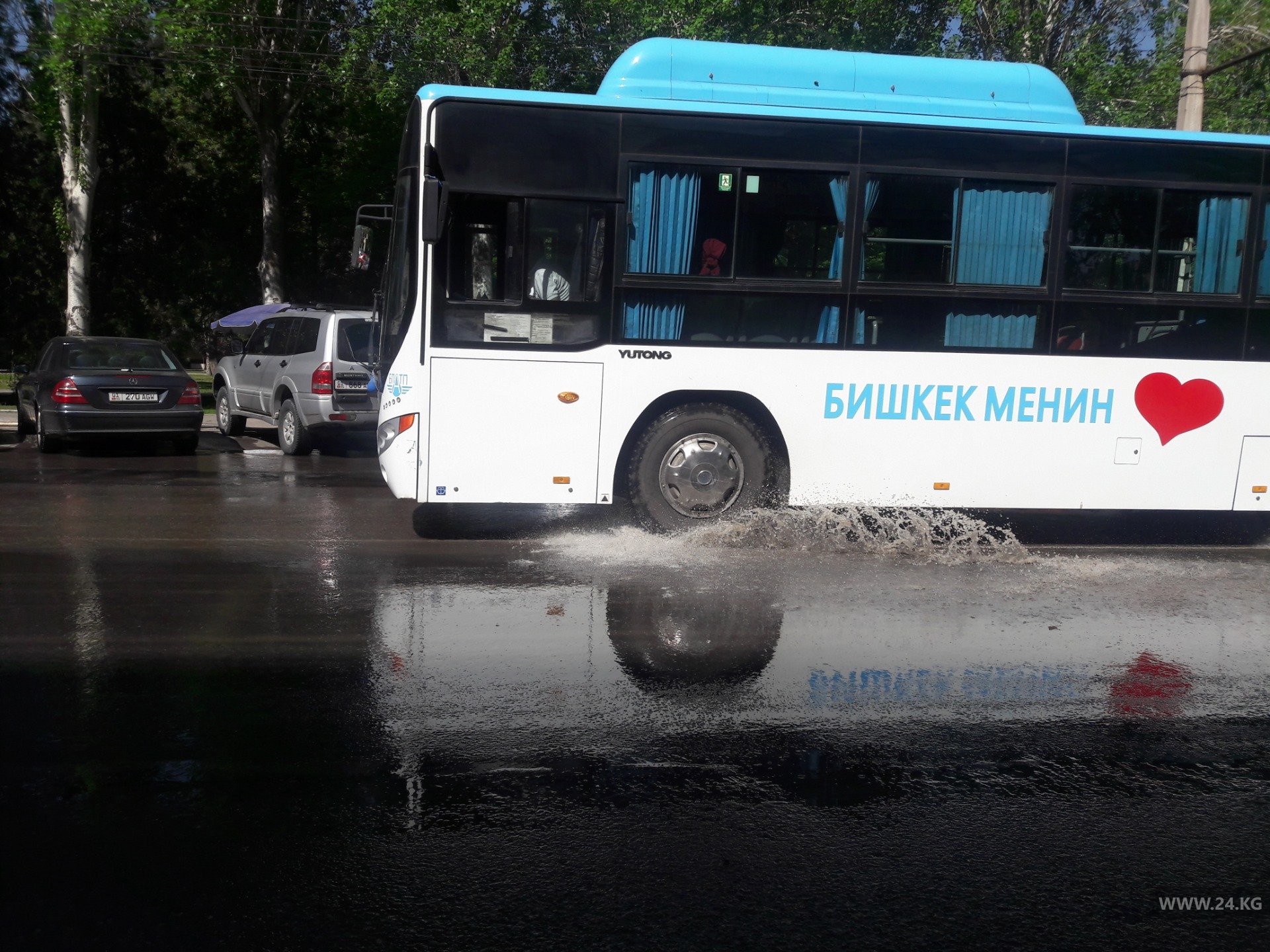 По его словам, перед торговым центром ЦУМ-2 арык забился мусором. Проезжая часть превратилась в сплошной поток воды.