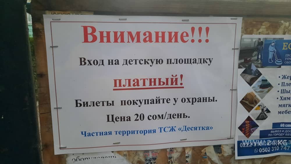 В 10-м микрорайоне возле дома № 10 вход на детскую площадку сделали платным. Об этом 24-kg.com сообщил читатель.