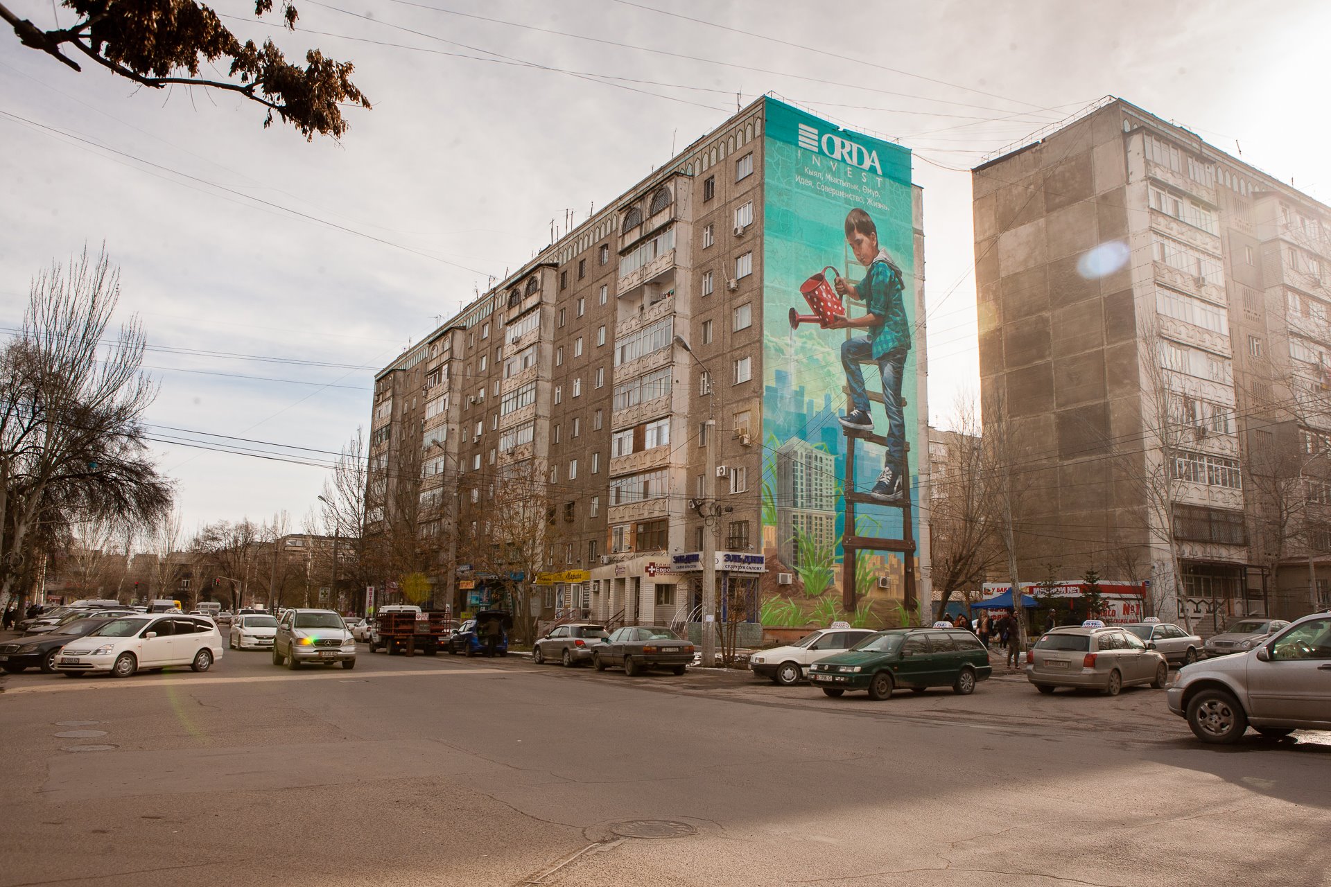 В центре Бишкека мурал на многоэтажном доме закрыли рекламным баннером. Об этом 24-kg.com сообщил читатель.