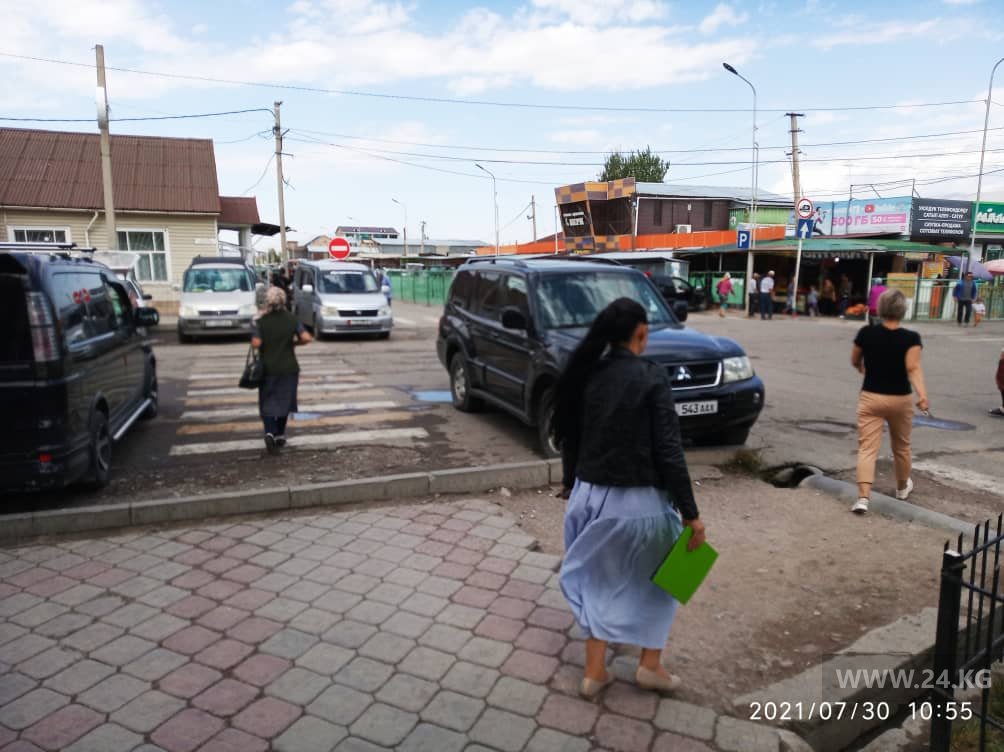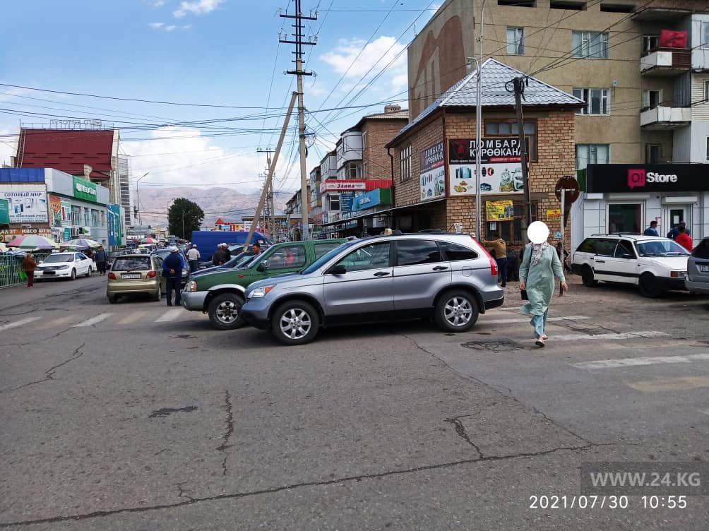 На тротуаре, да еще и на разметке пешеходного перехода, встали и владельцы этих авто в Оше.