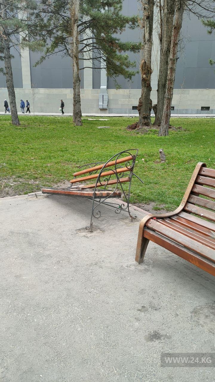 В Бишкеке в сквере «Театральный» сломали скамейку. Об этом 24-kg.com сообщил читатель.