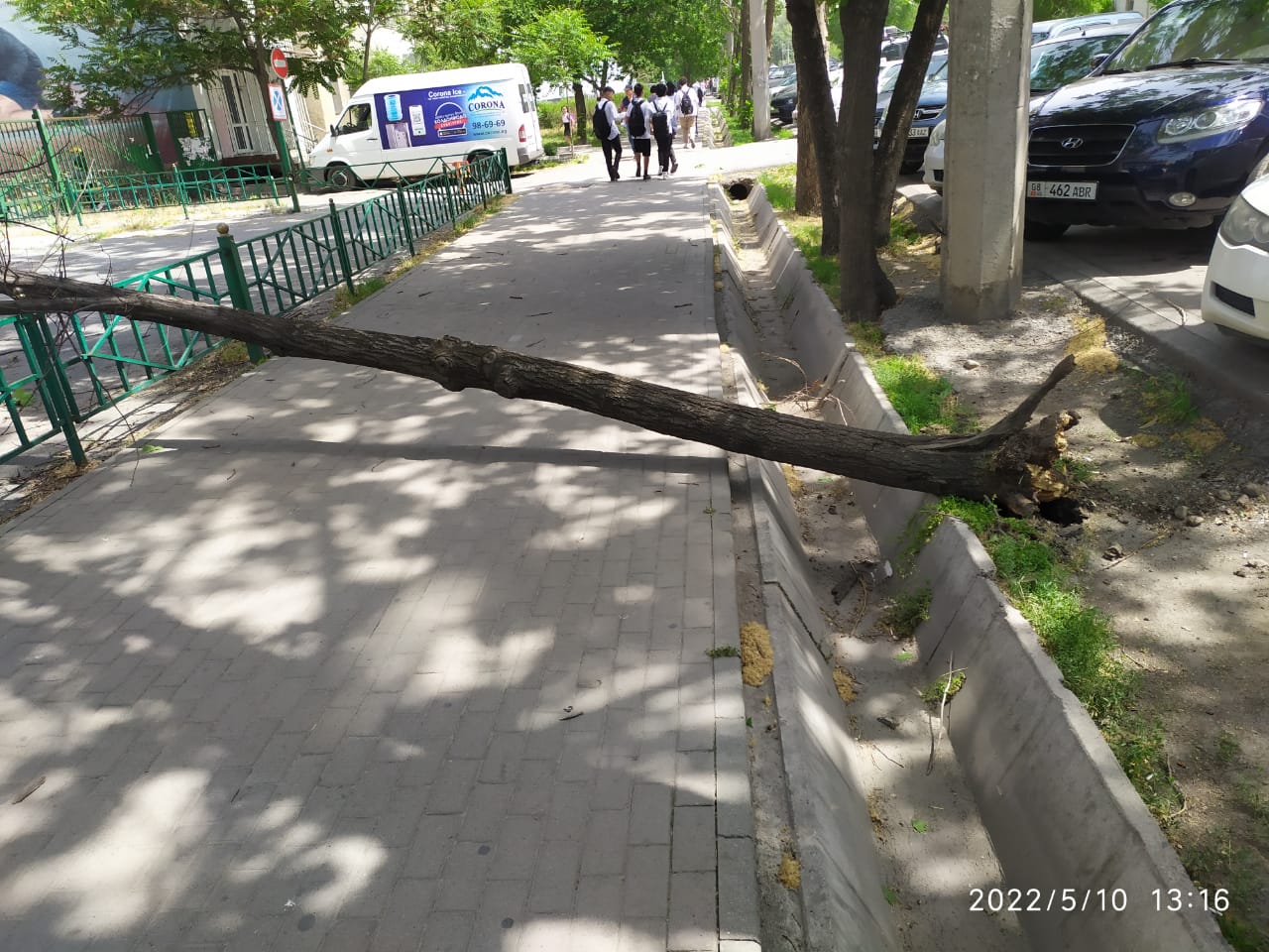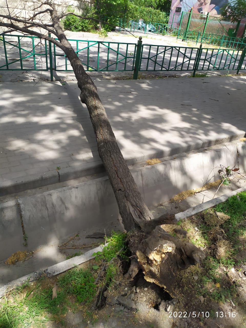 По его словам, дерево упало на тротуар в районе пересечения улиц Абдрахманова и Токтогула.