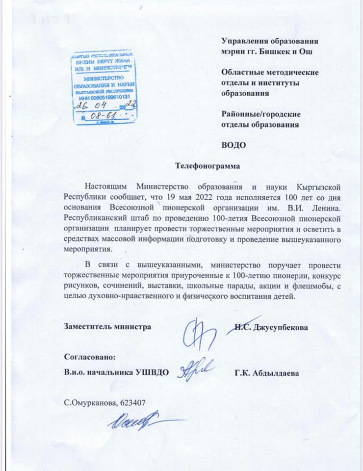 В соцсетях также распространили телефонограмму заместителя министра образования Надиры Джусупбековой. Она поручила школам провести торжественные мероприятия, приуроченные к 100-летию Всесоюзной пионерской организации.