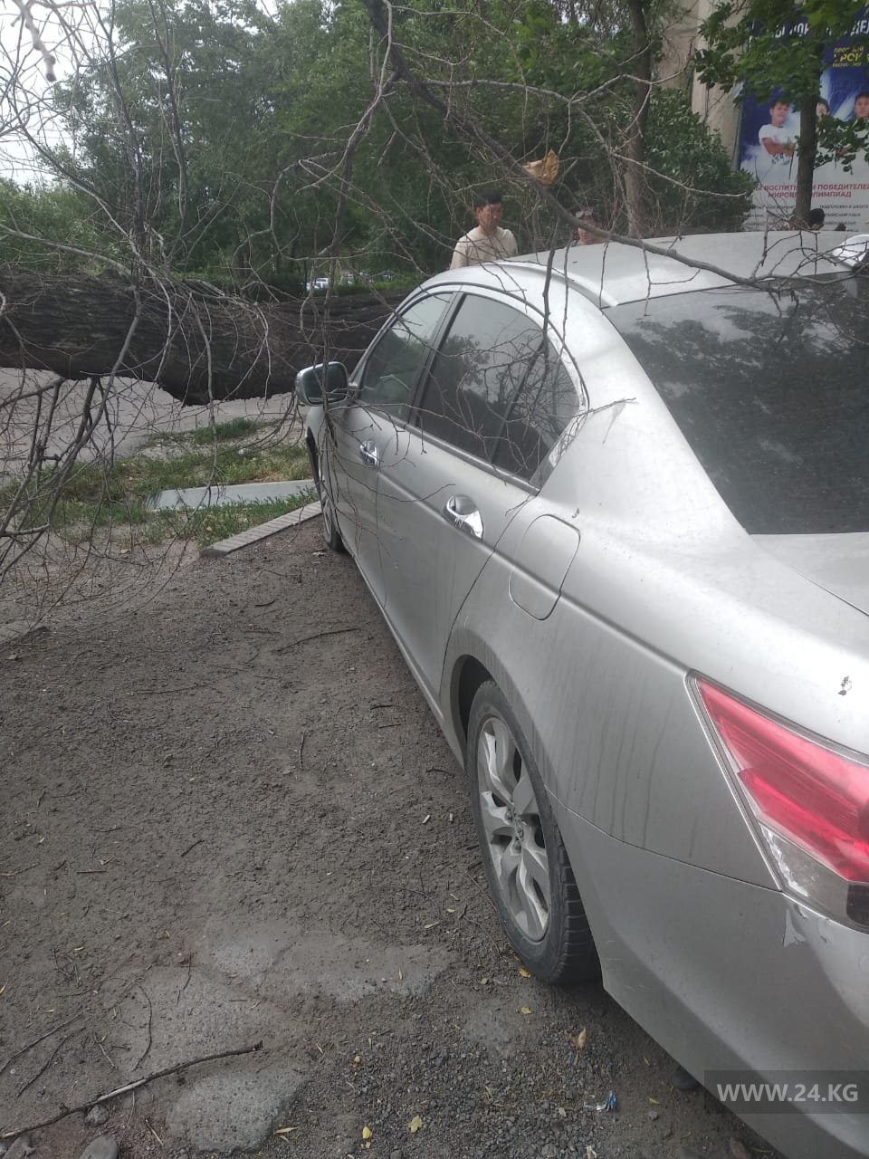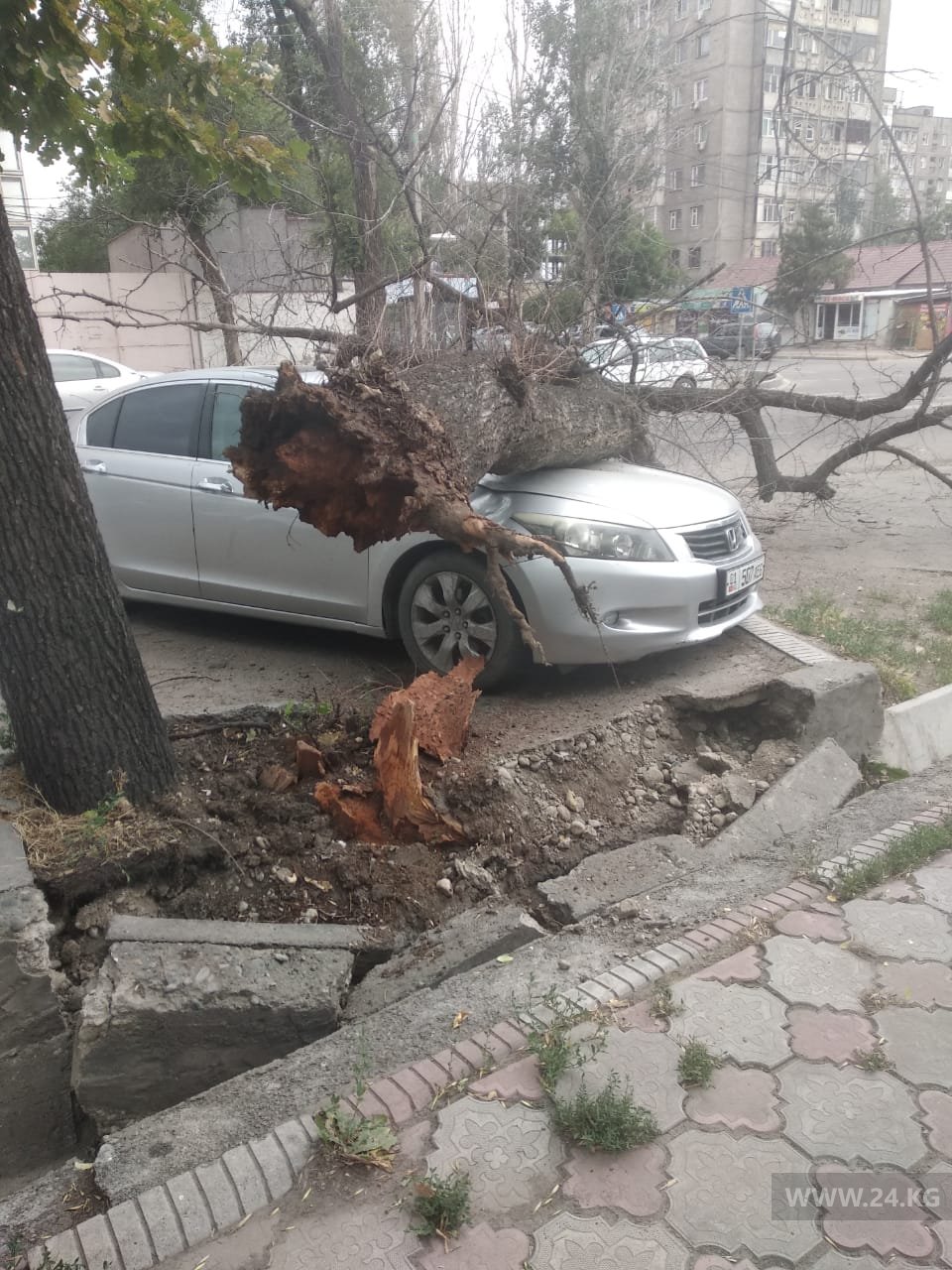 В центре Бишкека дерево упало на припаркованный автомобиль. Об этом 24-kg.com сообщил читатель.