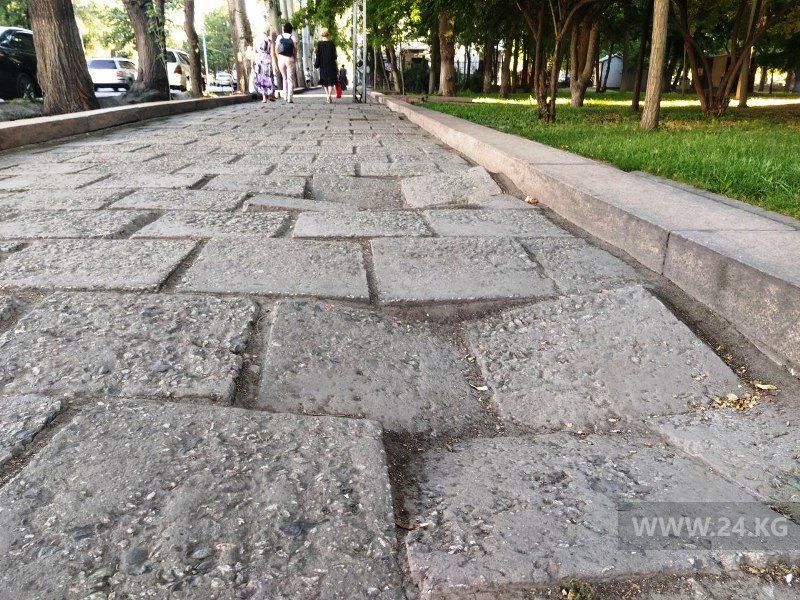 «Пересечение улицы Абдрахманова и проспекта Чуй. Тротуар напротив библиотеки Касымалы Баялинова весь в ямах от просевшей плитки. Чуть дальше, возле подземного перехода в арык свалились плиты бордюра. Руководство Первомайского района ходит по улицам с завязанными глазами? Неужели так сложно поправить несколько блоков и выровнять просевшую плитку?» — спрашивает он.