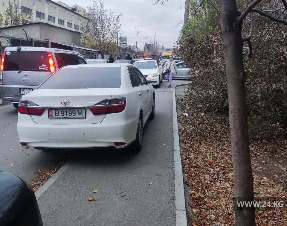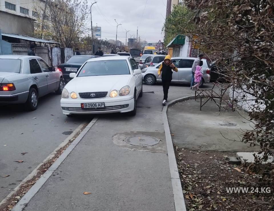 На улице Байтика Баатыра автохам также заехал на тротуар, подвергая опасности идущих.