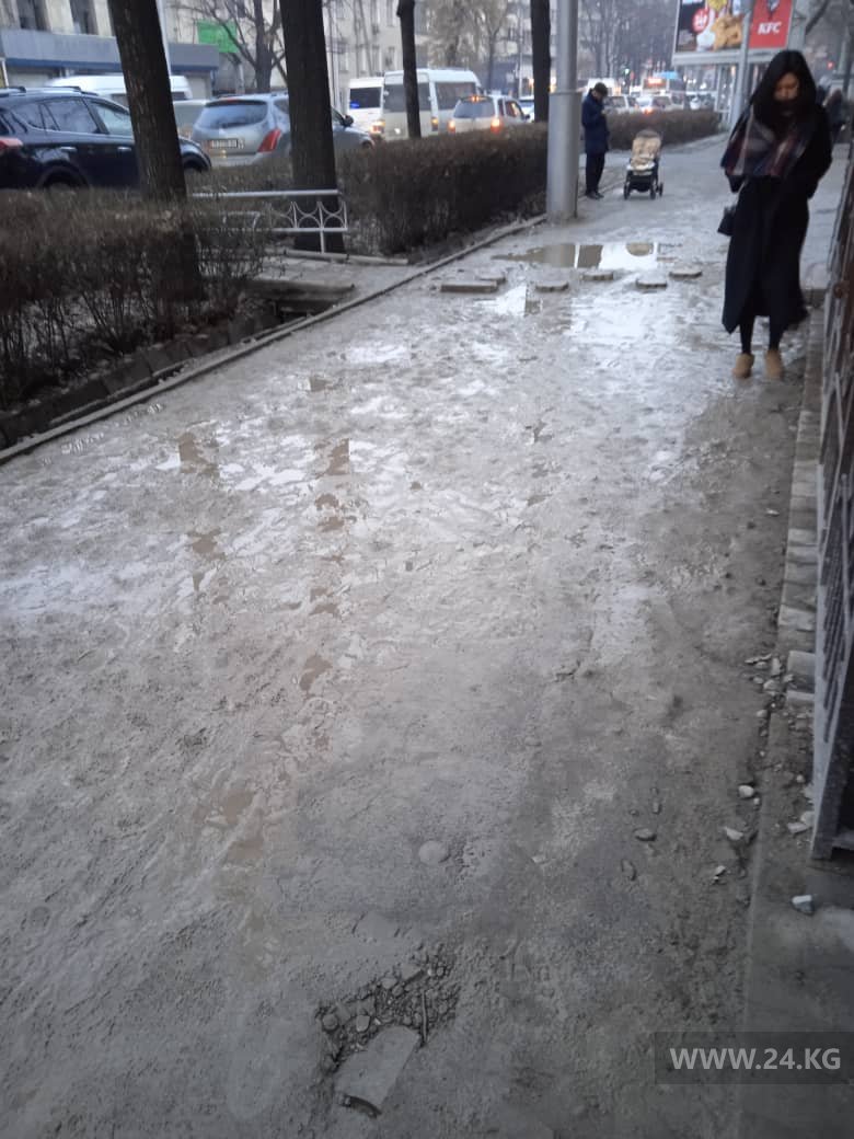 Сложно пройти, не испачкав обувь, и на улице Киевской между Тыныстанова и бульваром Эркиндик.