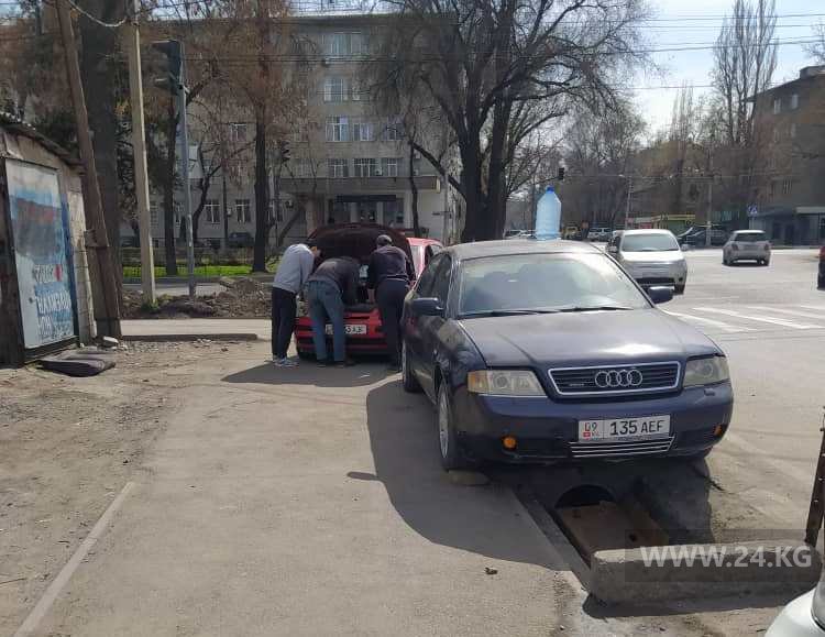 В районе пересечения улиц Орозбекова и Жибек Жолу организовали ремонт машин на тротуаре.