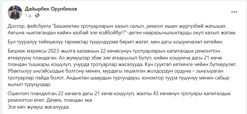 «Друзья, в Facebookе пишут: «Тротуары в Бишкеке перекопаны и не ремонтируются. Я читаю жалобы, горожан: «Не стоило начинать копать, если не могут завершить до конца». В соответствующих сетях дают пояснения по этому поводу, я тоже хочу добавить. В 2023 году мэрия Бишкека планировала отремонтировать тротуары 22 улиц города. Эти работы уже завершены, затем вне плана добавлена еще 21 улица, сейчас на них ведется ремонт тротуаров. Он будет закончен до того, как похолодает. Это временное неудобство. На смену старым неудобным дорогам будут удобные асфальтированные тротуары. Поэтому жители города, приезжие, пожалуйста, поймите и наберитесь терпения», — написал он на своей странице в Facebook.