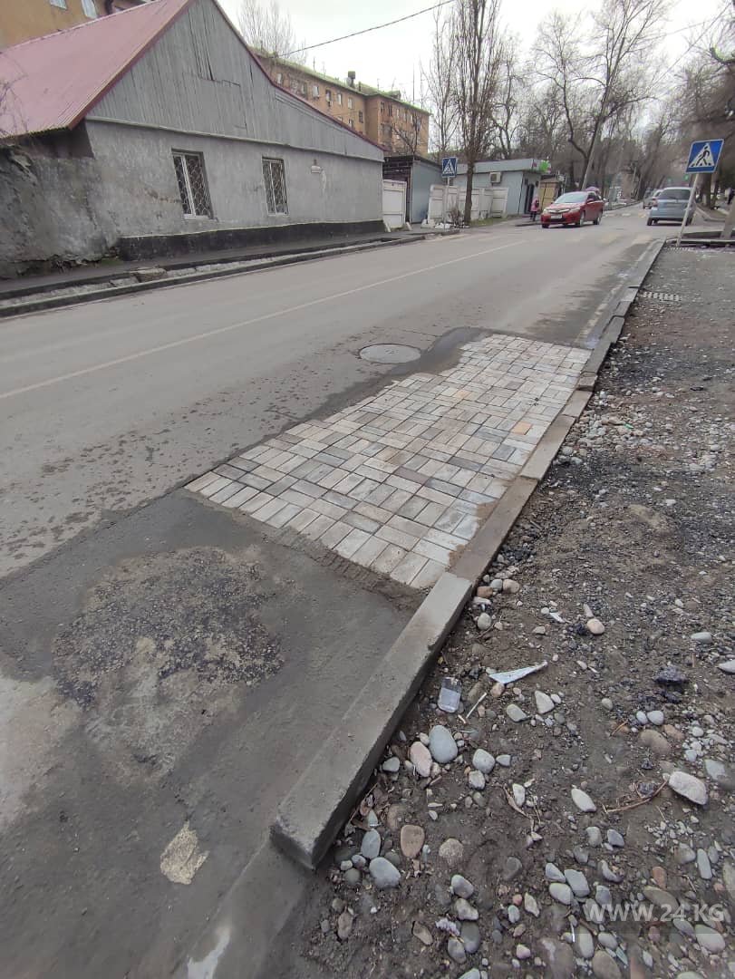 На улице Руставели в Бишкеке провалившийся асфальт заделали брусчаткой