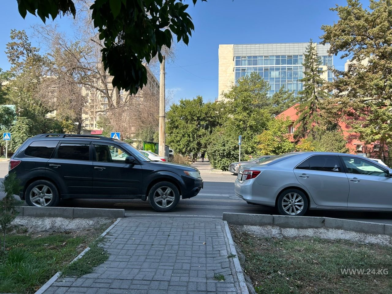 На улице Тыныстанова автомобилями закрыли проход к зебре.
