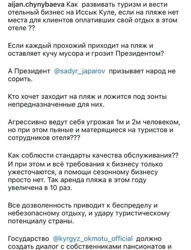«Если каждый прохожий приходит на пляж и оставляет кучу мусора и грозит президентом? А президент призывает народ не сорить. Кто хочет, заходит на пляж и ложится под зонты, не предназначенные для них», — отметила Айжан Чыныбаева.