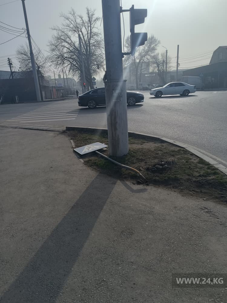 По его словам, на пересечении улиц Лермонтова и Салиевой дорожный знак пешеходного перехода лежит на земле. Бишкекчанин просит соответствующие городские службы устранить поломку.