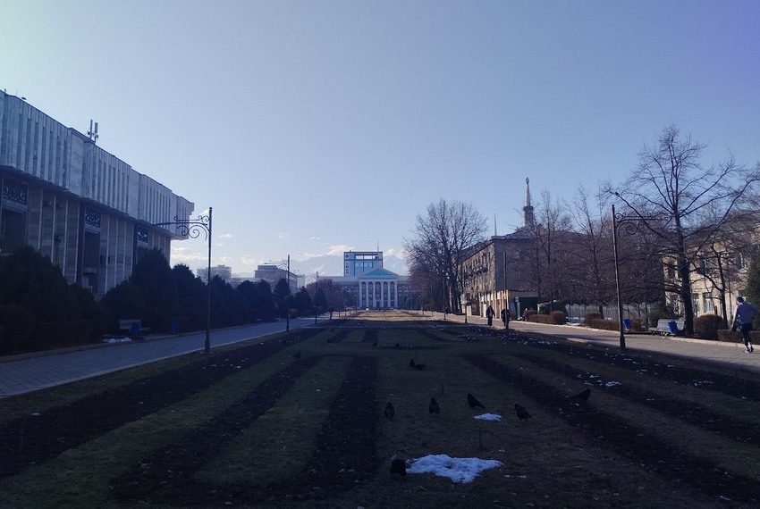 Сначала прогуляемся немного по февральскому Бишкеку. А именно по Аллее молодежи, расположенной между столичной мэрией и Кыргызским национальным университетом.