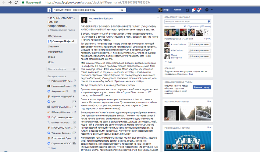 «Около 400 сомов нам вернули через 1,5 часа разборок из-за 20-сомовых вафель, которые мы якобы покупали, и чая, пробитого 3 раза (плюс бонусные хлебцы из-под стола кассирши). Деньги деньгами, а вот время и нервы уже не вернешь», — написала Нуржамал Джаныбекова и посоветовала горожанам быть бдительными и проверять чеки.