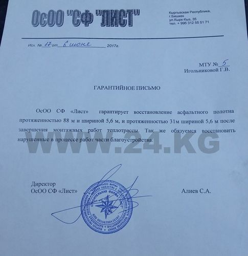 Мы решили обратиться напрямую к компании и узнать, когда же строители доведут дело до конца и устранят оставленную после себя разруху. Представители ОсОО «Лист» пояснили ИА «24-kg.com», что в настоящее время компания «накапливает средства», и клятвенно заверили, что с 12 августа рабочие начнут восстанавливать разрушенное асфальтовое покрытие во дворе столичного микрорайона «Джал».