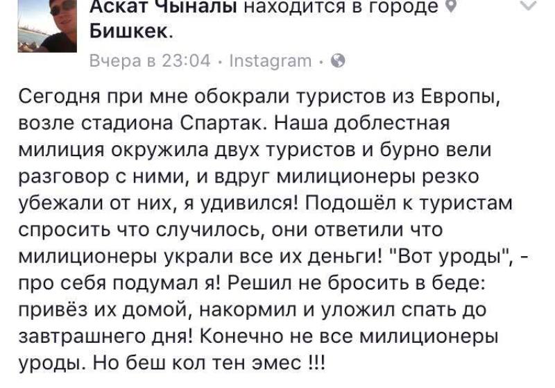 В Бишкеке люди в милицейской форме ограбили туристов из Европы. Об этом сообщил пользователь социальных сетей Faсеbook Аскат Чыналы.