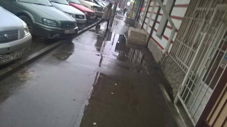 «Прогулялся по отремонтированной в прошлом году улице Киевской, везде лужи, и вода никуда не уходит, тротуар не продуман», — сообщил читатель на номер WhatsApp ИА «24.kg».