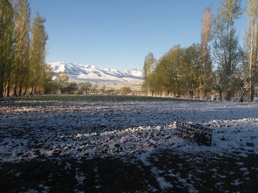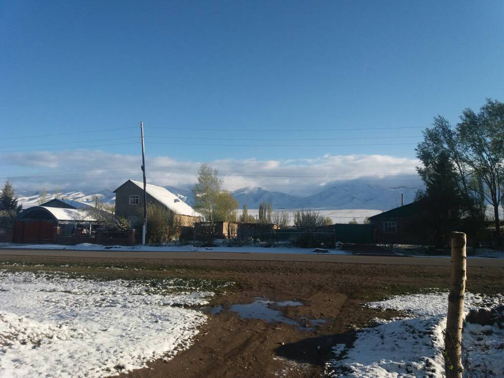 В Ак-Суйском районе Иссык-Кульской области ночью выпал снег. Фотографии из села Советского ИА «24-kg.com» прислал читатель.