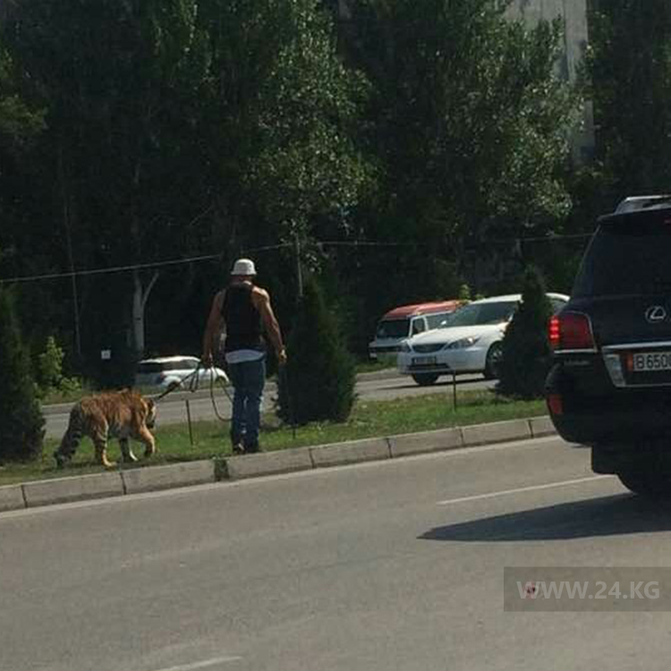 В Бишкеке на улице Токомбаева мужчина выгуливает тигра. Об этом ИА «24-kg.com» сообщили читатели.