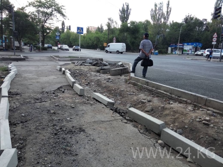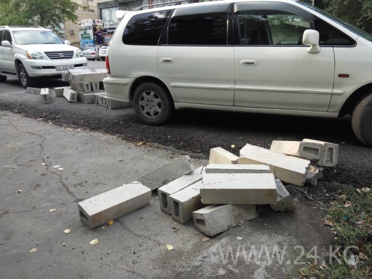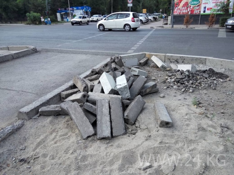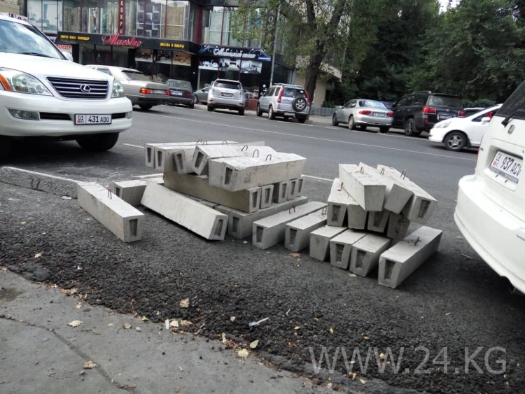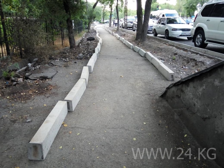 На разрушенном тротуаре на Московской улице устанавливают новые бордюры. Об этом ИА «24.kg» сообщил читатель.