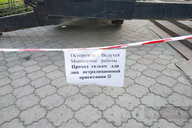 При этом к перекрытию тротуара подошли с юмором, сопроводив монтажные работы плакатом с надписью, что «проход только для лиц нетрадиционной ориентации».