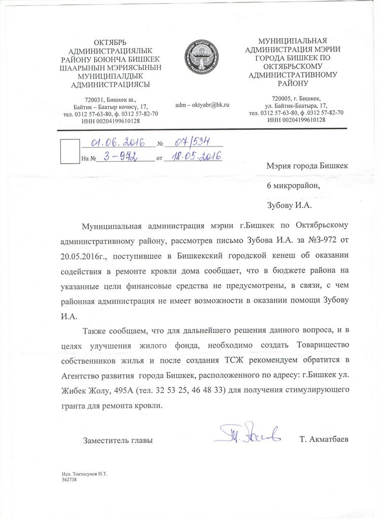 «Средства у нас не предусмотрены кому бы-то ни было, будь это ветеран или нет. Поэтому такой ответ и прозвучал. Но мы предложили создать в этом доме ТСЖ, в настоящее время объект бесхозный, он не обслуживается ни ОсОО, ни бывшим домоуправлением. При условии создания ТСЖ город готов рассмотреть вопрос выдачи 50-процентного стимулирующего гранта при условии, что оставшиеся 50-процентов жители соберут сами. Мы таким образом стимулируем, чтобы жильцы сами содержали свою собственность. Квартиры-то их, приватизированные. Почему мы должны их крышей заниматься? Поэтому вопрос не в персоналии ветерана, а в целом, в концепции», - пояснил ИА «24.kg» заместитель главы Таалайбек Акматбаев.