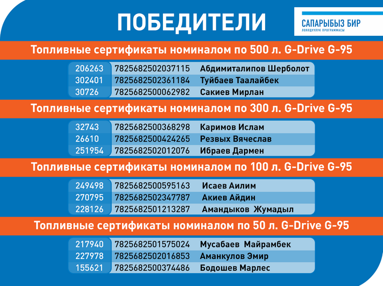 Сеть АЗС «Газпромнефть» поздравляет победителей розыгрыша по акции «Сапарыбыз бир 3 года» и благодарит своих клиентов за участие!