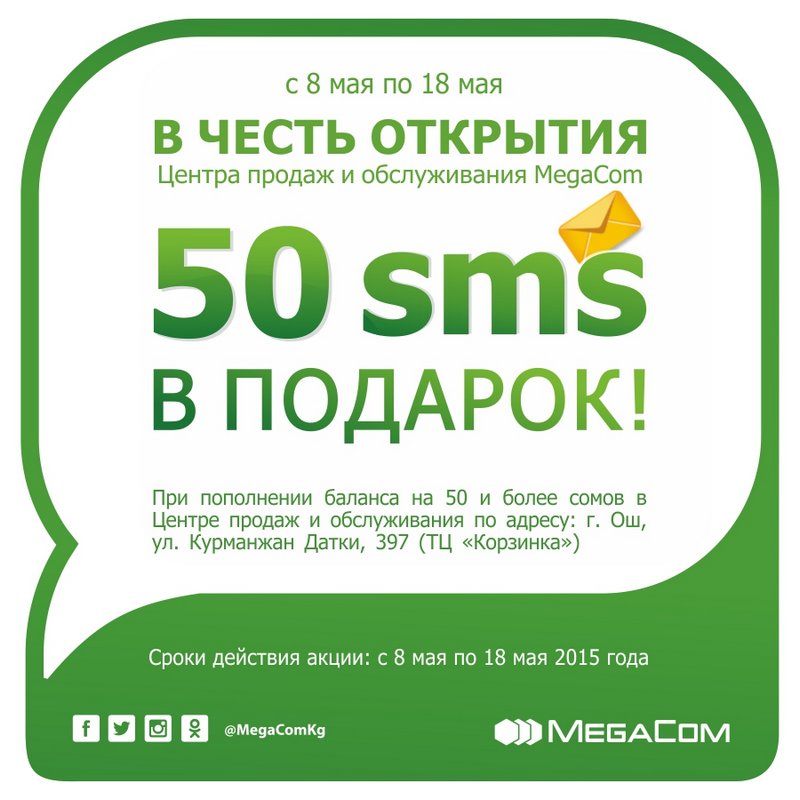 Традиционно в честь открытия действует акция: абоненты, пополнившие баланс на 50 и более сомов в новом Центре продаж и обслуживания MegaCom с 8 мая по 18 мая 2015 года включительно, автоматически участвуют в акции и получают 50 SMS бесплатного общения в сети на 10 дней в подарок. Проверить состояние бонуса можно по номеру *505#.