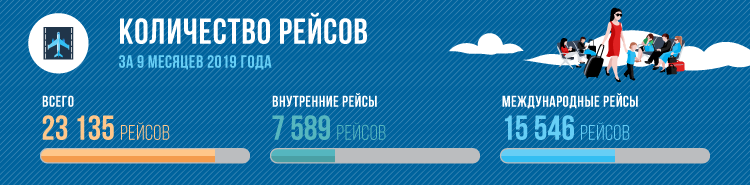 За девять месяцев 2019-го ОАО «Международный аэропорт «Манас» обслужило 2 миллиона 714 тысяч 706 пассажиров, что на 46 тысяч больше, чем за аналогичный период прошлого года. Из них на внутренних авиалиниях пассажиропоток составил 867 тысяч 866 человек, на международных — 1 миллион 846 тысяч 840.