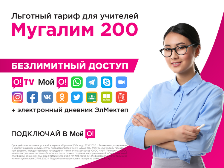 Новые подключения к тарифу «МУГАЛИМ 200» будут производиться по запросу руководства и учителей средних общеобразовательных учреждений. Также учитель может самостоятельно пройти регистрацию в приложении «Мой О!». Все подробности читайте на сайте o.kg.