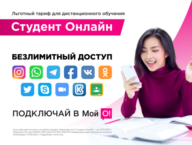 Если ты студент, для тебя тоже есть специальный тариф «Переходи на О! Студент Онлайн». Просто пройди регистрацию в приложении «Мой О!». Скачай или обнови приложение, если оно уже у тебя установлено. Зайди в меню «Тарифы», найди категорию «Для обучения», выбери вкладку «Для студента» и заполни специальную форму. Подробнее о тарифе на сайте o.kg.