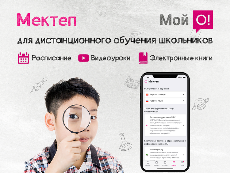 В специальном разделе «Мектеп» собрано все необходимое для онлайн-обучения: расписание уроков, образовательные ресурсы, видеоуроки и электронные книги. Для удобства учащихся предусмотрена возможность выбора языка обучения (кыргызский и русский), а весь контент распределен по классам и предметам.