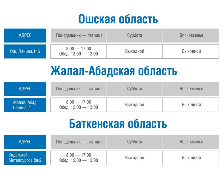 В таблице — актуальные графики работ центров обслуживания населения в Бишкеке, Чуйской, Ошской, Джалал-Абадской и Нарынской областях.